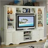 Riverside Furniture Riverside Furniture Splash of Color 50-Inch TV Entertainment CenterRiverside's products are designed and constructed for use in the home and are generally not intended for rental, commercial, institutional or other applications not considered to be household usage.Riverside uses furniture construction techniques and select materials to provide quality, durability, and value in our products and allows us to meet the wide range of design and budget requirements of our customers. The construction of our core product line consists of a combination of cabinetmaker hardwood solids and hand-selected veneers applied over medium density fiberboard (MDF) and particle board. MDF and particle board are used in quality furniture for surfaces that require stability against the varying environmental conditions in modern homes. The use of these materials allows Riverside to design heirloom quality furnishings that are not only beautiful, but will increase in value through the years. Constructed of hardwood solid and engineered woodTop section features two adjustable framed shelves with polished-edge glass inserts and one fixed bottom panelOne accent light in top section is mounted in the top panel to illuminate throughout entire upper section and is controlled with a touch switchOne center drawer is constructed with dovetail joinery, mounted on ball-bearing side-mount guides and has a dust panel underneath; One bottom door features a frame with a louvered-style panel insert and encloses one center adjustable shelf and one fixed bWiring access hole with grommet and cap in back panel behind door, plus wiring access hole and ventilation hole in upper section for cord and lightTwo outside doors feature a frame with a louvered-style panel insert and each encloses one center adjustable shelf and one fixed bottom panelOpen center section has two removable shelves and one fixed bottom panel for storing electronicsTip restraining hardware includedBase levelersShores White finish