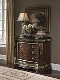Del Corto Bed Chest. Del Corto is a fresh redesign of a traditional style to incorporate modern conveniences. Crafted using book matched cherry veneers, it's richly appointed acanthus leaf overlays, detailed urn finials, intricate moldings, and impressive shell motif crowns on the headboard and mirror are all elements of old world European elegance. Mouldings are detailed through a multi-step finish process and tipped with gold dry-brushing to create a regal antiqued appearance. The collection includes a generous bed chest which can be used on its own, as an accent piece or bedside in place of a nightstand. The dresser includes a drop-front drawer feature for media components, felt insert in top side drawers and cedar bottom panel in center base drawer. Chests feature black laminated granite tops and full extension ball bearing drawer guides for complete access. It even includes a refined matching upholstered bench for sophistication and practicality.Length 22.00Height 38.00Width 46.00Assembly Required YesStyle TraditionalFinish Dark WoodColor Brown
