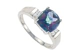 Mystic Topaz and Diamond Ring : 14K White Gold - 3.33 CT TGW Size 10A rare square mystic topaz is prong-set in 14K white gold and is complemented by 4 diamonds. This ring has a total gem weight (TGW) of 3.33 ct.